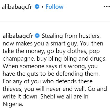 "When someone says it's wrong, you have the guts to be defending them. For any of you who defends these thieves, you will never end well. Go and write it down. Shebi we all are in Nigeria."