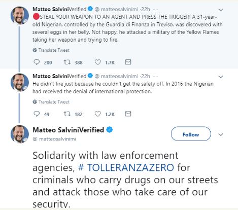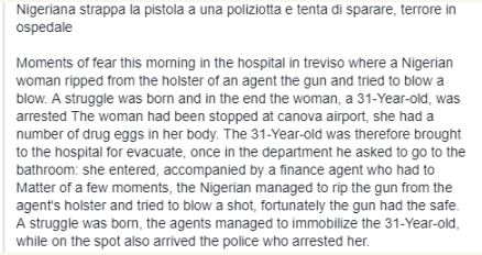 According to reports, the Nigerian woman who was apprehended at the Canova Airport in Trevisto, had allegedly ingested drugs and was taken by the officials to the hospital in a bid to evacuate them.