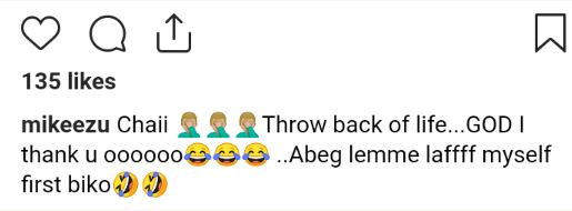He wrote; "Chaii Throw back of life...GOD I thank u oooooo ..Abeg lemme laffff myself first biko"