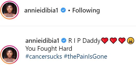 Annie Idibia, one of Nollywood's popular actresses, has lost her father to the cold hands of death.