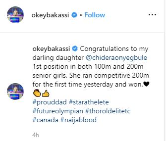 Announcing that his daughter won an athletics competition in Canada, Okey Bakassi wrote;