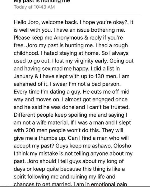 Relationship blogger, Joro Olumofin has shared the story of a lady who is finding it difficult to get married due to her ugly past.