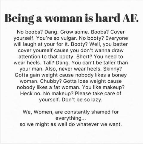 She wrote: "No work? "She's so lazy." Work? "Stay home and take care of the family." No child. "Not a real woman." Child. "Why did she start something she's not ready for?" No money. "Liability". Money. "The man is the provider. What is she looking for." No class. "Illiterate". Class. "Snob". No ambition. "Waste." Ambition. "She doesn't know her place."