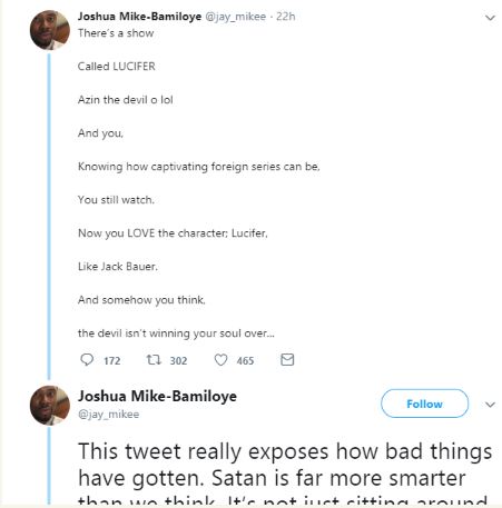Joshua Bamiloye who spoke against movie series, 'Lucifer' in new tweets he shared, stated that the devil is using it to win souls for himself.