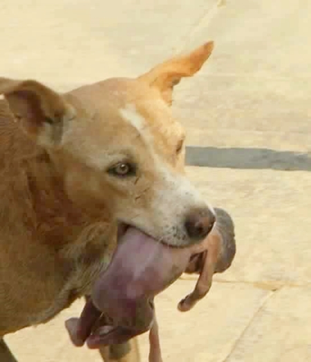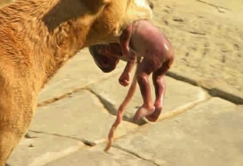 The graphic images shows a dog carrying a newborn baby in its mouth, with the baby's umbilical cord still attached.