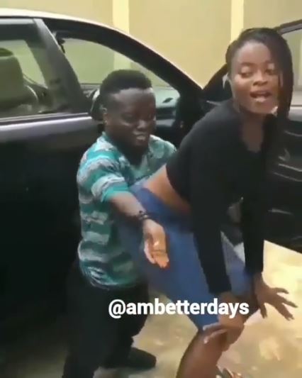 The video got many laughing as the tall, young lady totally surrendered herself to the dwarf guy.