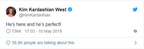 Reality TV star Kardashian West shared the news of the birth on Twitter on Friday, writing: “He’s here and he’s perfect!”