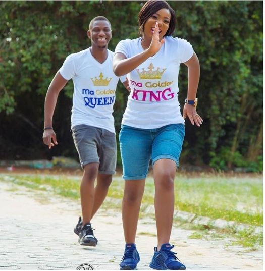 A Nigerian couple-to-be rock customized T-shirt as fiance chases his fiancee in their pre-wedding photoshoot.