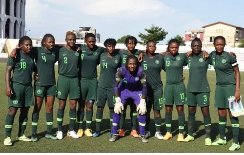 Nigeria’s woman football team players pose before a match between Niger and Nigeria in the second West African Football Union (WAFU) zone B women’s tournament at The Parcs des Sports in Abidjan on May 11, 2019. (Photo AFP)