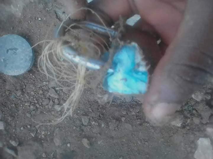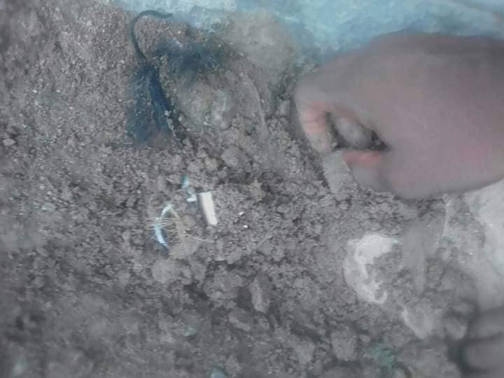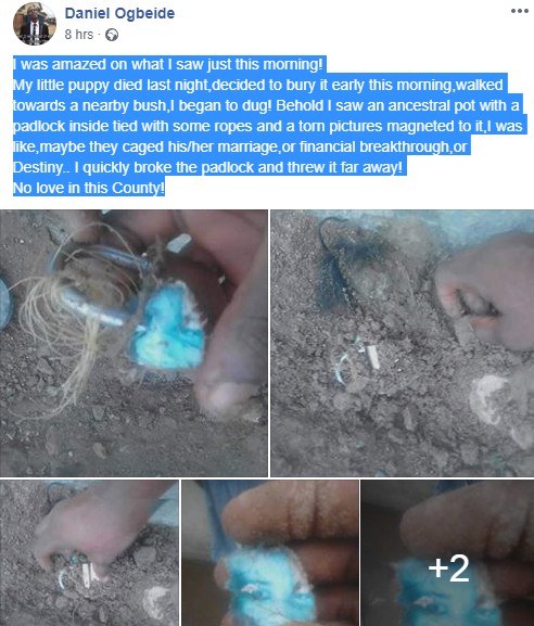 “I was amazed on what I saw just this morning! My little puppy died last night, decided to bury it early this morning, walked towards a nearby bush, I began to dug! Behold I saw an ancestral pot with a padlock inside tied with some ropes and a torn pictures magneted to it. I was like, maybe they caged his/her marriage, or financial breakthrough,or Destiny.. I quickly broke the padlock and threw it far away! No love in this County!”