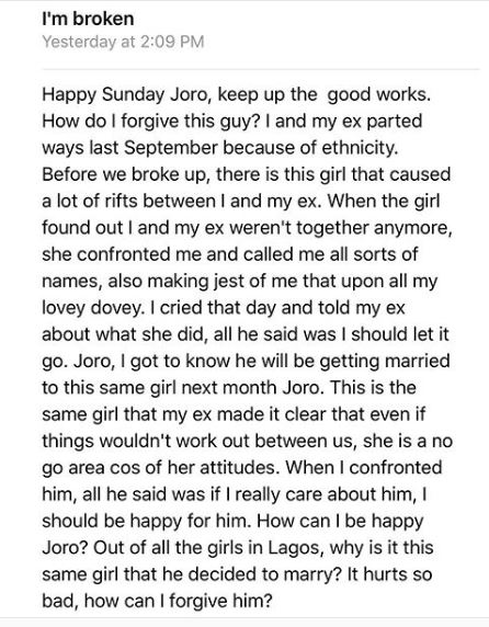 Relationship adviser and blogger, Joro Olumofin has shared the story of a lady who is presently heartbroken.