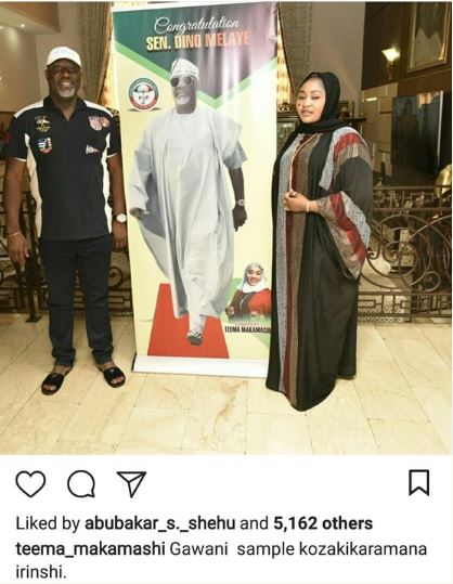 In what could be regarded as a response to Teema's Challenge, Fati Muhammad posted pictures on her Instagram Page that showed her meeting with Senator Dino as she presents a copy of CD Plate that contains the song she made for him and a poster she made for him just like that of Teema, with a Message that reads: 'Thanks so much sir God bless you I really appreciate for what you did to me sir may God continue giving our mother R.I.P and forgive her Amin. May Allah uplift you and increase your wealth.