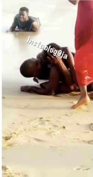 Two Lovers Kissing At Elegushi Beach In Lagos, Almost Swept Away By Water (Video)
