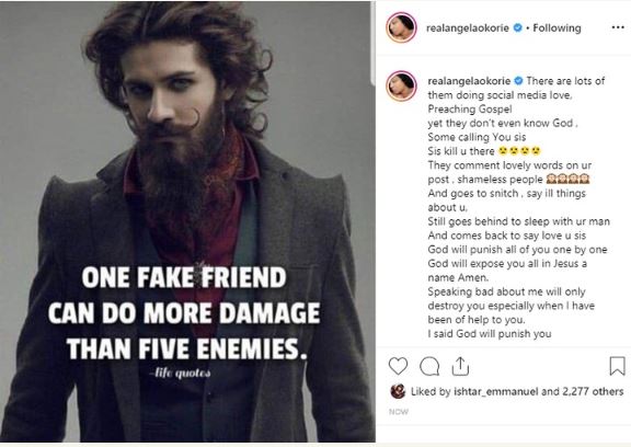 Angela Okorie who called out her fake friends who slept with her man via Instagram, wrote;