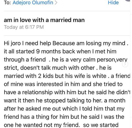 Relationship adviser, Joro Olumofin has shared the story of a lady who is in love with a married man.