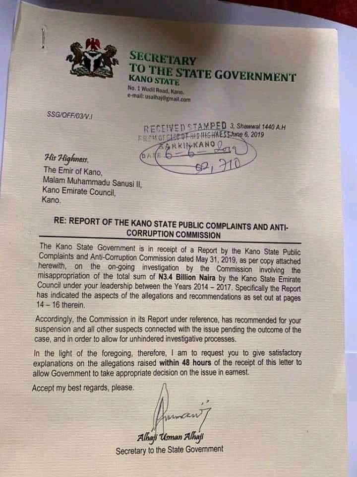 "The Kano State Government is in receipt of a Report by the Kano State Public Complaints and Anti-Corruption Commission dated May 31, 2019, as per copy attached herewith, on the on-going investigation by the Commission involving the misappropriation of the total sum of N3.4 Billion Naira by the Kano State Emirate Council under your leadership between the Years 2014 – 2017. Specifically the Report has indicated the aspects of the allegations and recommendations as set out at pages 14 – 16 therein.