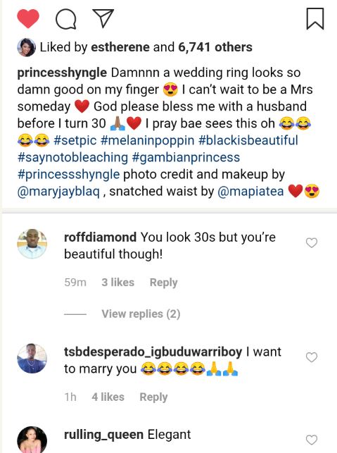 'Damnnn a wedding ring looks so damn good on my finger I can’t wait to be a Mrs someday God please bless me with a husband before I turn 30 I pray bae sees this oh #setpic #melaninpoppin #blackisbeautiful #saynotobleaching#gambianprincess #princessshyngle photo credit and makeup by @maryjayblaq , snatched waist by @mapiatea,' she said.