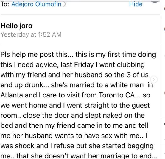She wrote her story to a relationship adviser, Joro Olumofin and this has become a hot topic on Instagram.