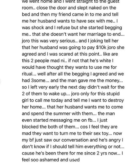 She visited the house of her friend in the U.S and was stunned to hear that her friend's husband was interested in her. After much pressure, she agreed to have s*x with the couple for a fee of $10,000.