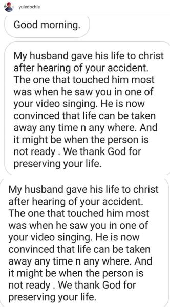 The actor shared a message he received from a follower telling him her husband gave his life to Christ after hearing of the actor's accident.