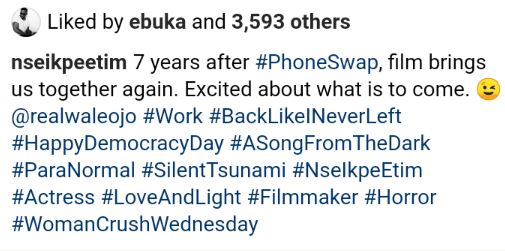 She wrote; "7 years after #PhoneSwap, film brings us together again. Excited about what is to come. @realwaleojo #Work #BackLikeINeverLeft #HappyDemocracyDay #ASongFromTheDark #ParaNormal #SilentTsunami #NseIkpeEtim #Actress #LoveAndLight #Filmmaker #Horror #WomanCrushWednesday"