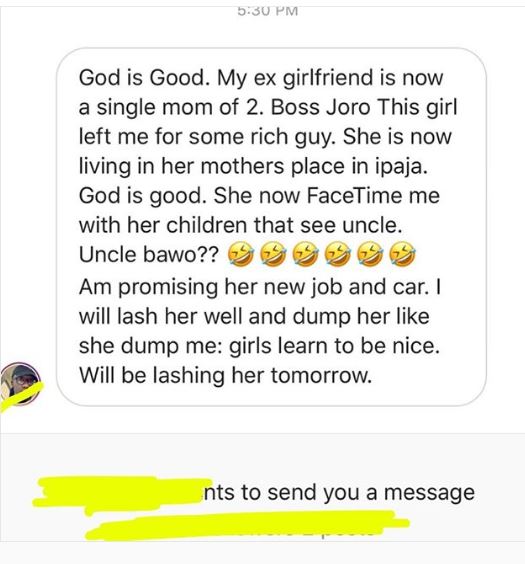 The young man who appears to have made good money is seeking vengeance against his ex-girlfriend who dumped him in the past.