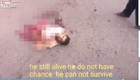 The dying man, who is missing his legs, is filmed by a crowd in the street.