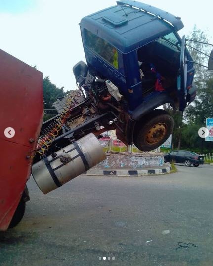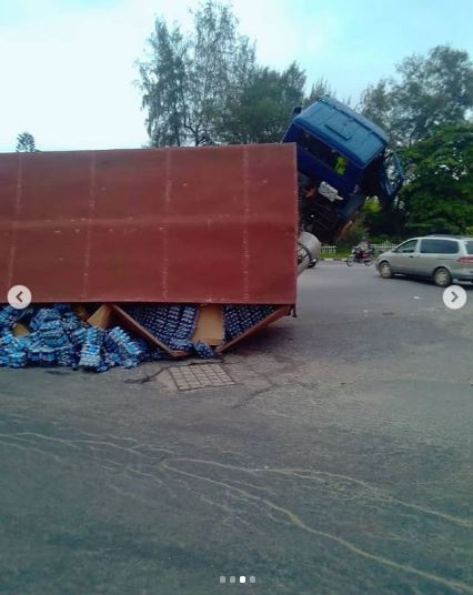 The cause of the accident remains unknown but the long truck carrying table water was seen in a bad shape. Luckily, there were so casualties involved.