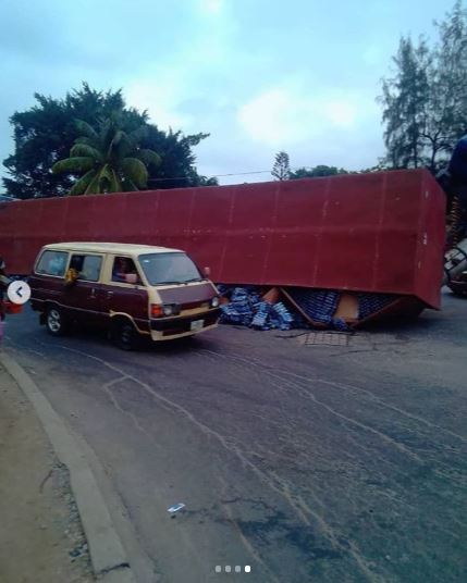 The truck fell at the busy Sumal area of Ring Road, Ibadan - Oyo State this morning at 07:10am thereby affecting vehicular movements.