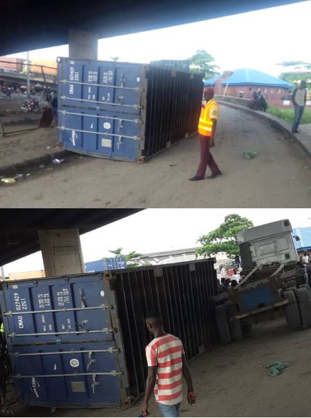 Earlier today, a 20-foot loaded container fell off its carrier truck. The accident occurred under the bridge, Danlami, inward Area B, Apapa, Lagos.