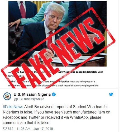 “#FakeNews Alert! Be advised, reports of Student Visa ban for Nigerians is false. If you have seen such manufactured item on Facebook and Twitter or received it via WhatsApp, please communicate that it is false,” the US said.
