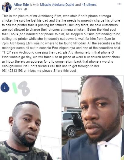 "This is the picture of mr Archibong Etim, who stole Eno"s phone at mega chicken he said he lost his dad and that he needs to urgently charge his phone to call the printer that is printing his father's Obituary fliers, he said customers are not allowed to charge their phones at mega chicken, Being the kind soul that Eno is ,she handed her phone to him, he stepped outside pretending to be calling the printer while she innocently sat down to wait for him,from 2pm to 7pm Archibong Etim was no where to be found till today. All the securities n the manager came all out to console Eno Akpan nya and one of the securities said THEY saw Archibong crossing the road, pls Archibong return that phone O Else wahala go dey, we will trace u to ur place of work n ur church better check ur inbox there's an address for u to come return back that phone a word is enough!!!!!!!!! Pls Eno"s friend's call this line to get through to her 08142313198 or inbox me please Share this post.