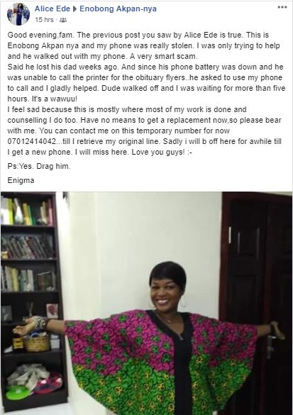 Good evening,fam. The previous post you saw by Alice Ede is true. This is Enobong Akpan nya and my phone was really stolen. I was only trying to help and he walked out with my phone. A very smart scam.