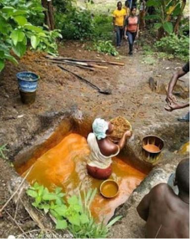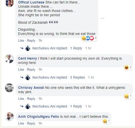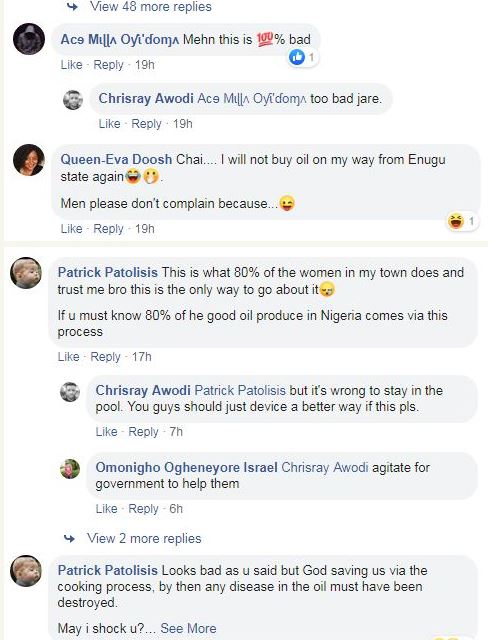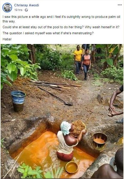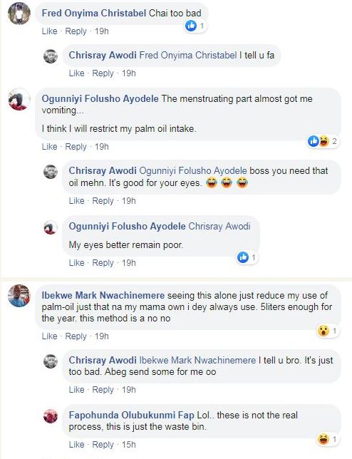A religious fanatic/Facebook user, Chrisray Awodi shared disturbing photos of the unhealthy method some villages making palm oil in Nigeira.