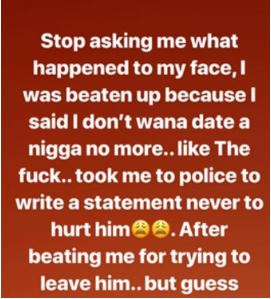 "”Let me put it straight.. I think most of u don’t understand me, I wasn’t beaten up by any girl, and Perhaps no girl can ever punch my eyes this way and won’t go to her early grave. I posted some days ago that I was done with a nigga I was kissing, that his gf should come get him, which later he bought icecream and apologized to me, gave me good head and we had a nice fuck, but he feel Inlove with a bad bitch, I told him let me spoil u, but I don’t do love, unfortunately he feel In love with the cruise I gave him, and nigga refused me to go have fun and he got addicted to me, when I finally made up my mind to go, he beat me up for breaking his heart,, like the fuck.. Y’all know am a badbitch, I don’t love, I only make u go crazy, put u on some estacy shit and fuck the hell outta u,, and I go, This nigga beat me up and took me to the police to sign.. with my two eyes closed with blood..like I don’t get.. is it by force to love? I didn’t even know what I signed for, maybe not to come after him for beating me.. but hey .. I was beaten because P*ssy too sweet that ur man wanted to keep me, but am a shameless hoe. I gave him cruise, he feel in love with it, now I gotta have a swollen eyes for having a sweet p*ssy??"