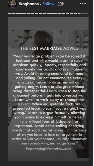 IK Ogbonna has taken to his Insta-Story today to share an advice on avoiding marital crisis, hours after his estranged wife, Sonia Morales confirmed that their marriage has ended.