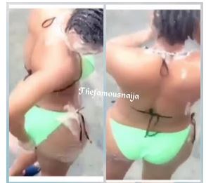 This is a video of an unnamed slay queen based in the highbrow Lekki area of Lagos State who decided to bath under the rain recently.