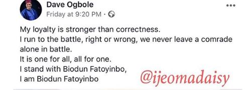 While showing support for Mr. Fatoyinbo, Dave Ogbole wrote: