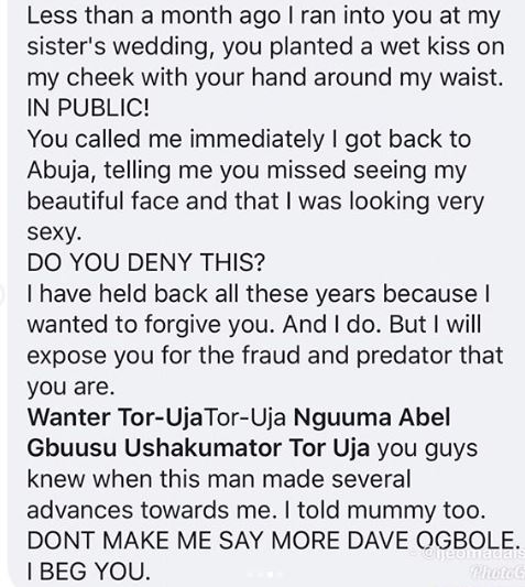 Not long after he shared the post, a young lady by the name Nguter Uja, took to the comment section to reveal how he [Ogbole] molested her in her father’s house.