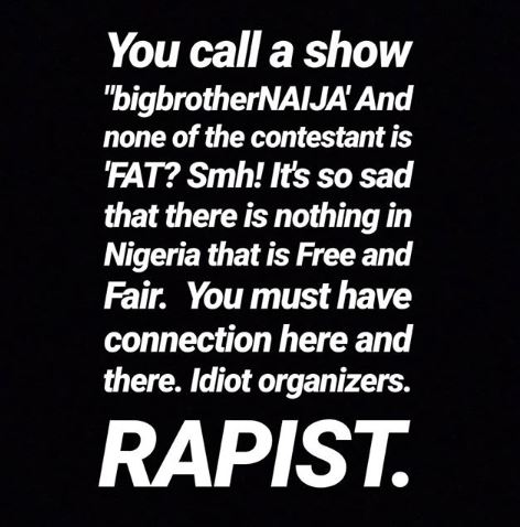 She said the organizers of the show shouldn't call it Big Brother Naija without any fat contestant.