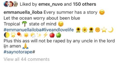 "Tropical state of mind #emmanuellailoba#liveandlovelife. Plus this ass will not be raped by any uncle in the lord ijn amen #saynotorape#"