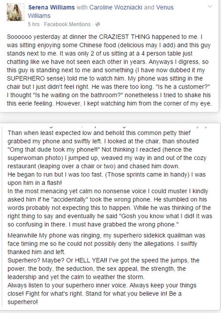 American Tennis star, Serena Williams stunned a petty thief that made away with her phone by giving him a hot chase that shocked him.