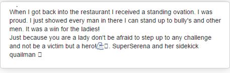 According to the story Serena shared on her Facebook page, she was out to dinner with a friend when the man came over and stood silently next to her at the table.