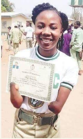 Female Corper Without Hands Shows Off Her NYSC Discharge Certificate (Photo)