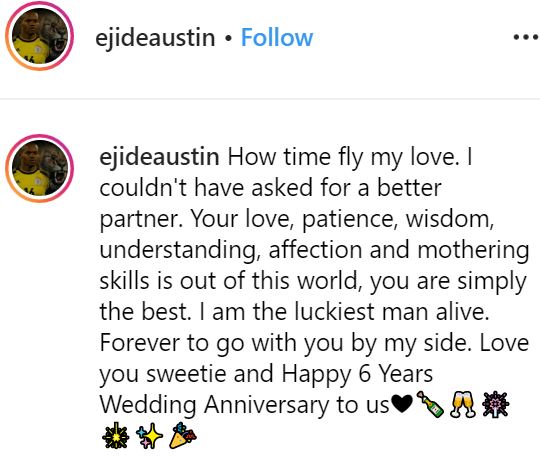Austin Ejide, a former Super Eagles No. 1 goalkeeper, and his wife, Chitto who got married in 2013 are celebrating their 6th wedding anniversary today, July 6, 2019.