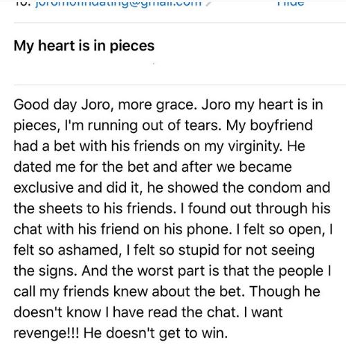 He took the evidence of s*x - condoms and stained bedsheets to show his friend. She is presently heartbroken and has written to a relationship adviser Joro Olumofin for assistance.
