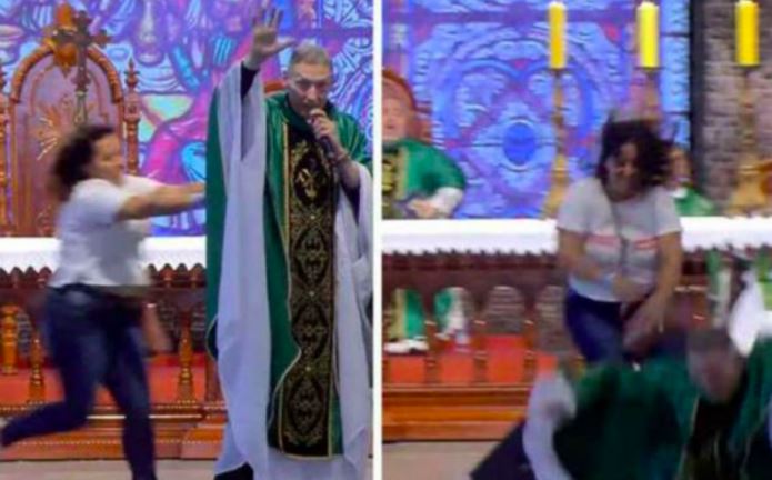 A video has shown the moment drama played out at the closing event of a retreat held by a Catholic TV, CanCao Nova, after Brazil's celebrity Catholic Priest Fr. Marcelo Rossi was pushed down from the altar by a yet-to-be-identified woman.