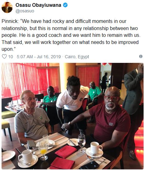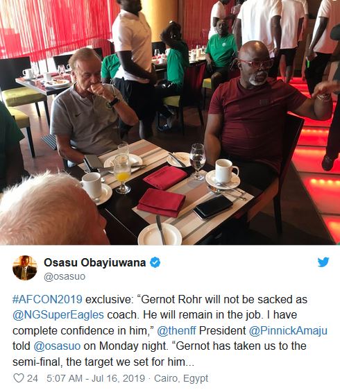 NFF president Melvin Amaju Pinnick in tweet with respected Nigerian journalist Osasu Obayiuwana said the Federation had no plan to relieve Rohr of his duties despite the Super Eagles crashing out in the semifinal stage of the AFCON.