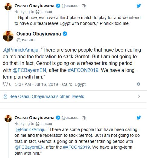 “Gernot Rohr will not be sacked as Super Eagles coach. He will remain in the job. I have confidence in him,” the NFF president said to @osasuo on Monday night. “Gernot Rohr has taken us to the semifinal, the target we set for him,” Pinnick added.