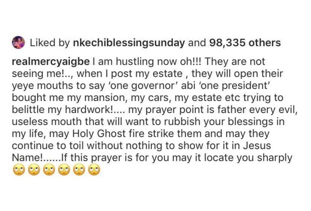 "I am hustling now oh!!! They are not seeing me!.., when I post my estate , they will open their yeye mouths to say ‘one governor’ abi ‘one president’ bought me my mansion, my cars, my estate etc trying to belittle my hardwork!…. my prayer point is father every evil, useless mouth that will want to rubbish your blessings in my life, may Holy Ghost fire strike them and may they continue to toil without nothing to show for it in Jesus Name!……If this prayer is for you may it locate you sharply."